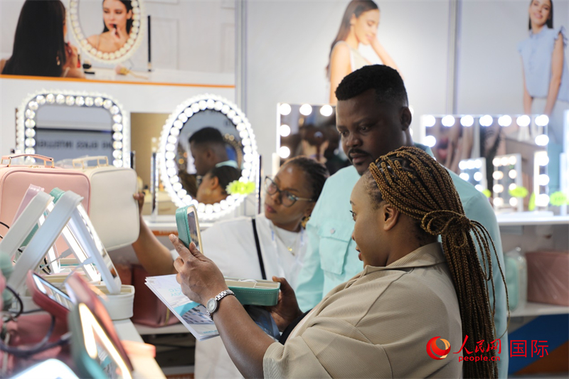 在第九届中南贸易博览会上,参观者在体验中国化妆镜产品。人民网记者 戴楷然摄