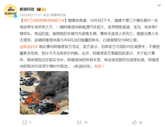 而4天后,阿维塔另一款车型阿维塔06也发生了起火事故。据媒体报道,10月5日,福建省宁德市三沙镇东壁村,一辆阿维塔06停车时突然起火,引起周围7辆车着火爆炸,包括奥迪、宝马、马自达、埃安等品牌汽车。