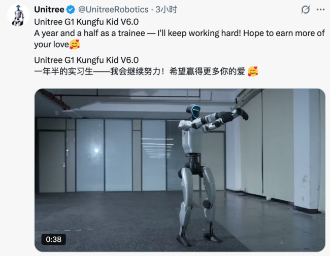 有趣的是,宇树这次发布的视频中的许多招式与北京天桥艺术中心《天工开物》舞剧百场纪念现场的动作颇为相似。那场演出的谢幕现场,宇树科技的机器人和机器狗登台亮相,伴着谢幕音乐大秀动作。