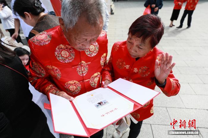 10月29日,正值重阳节,江西南昌滕王阁旅游区举办第八届金婚盛典活动,50对金婚夫妇齐聚滕王阁下,共度重阳佳节并庆祝金婚仪式。图为一对金婚老人,正在展示他们的金婚证书。中新社记者 刘思伟 摄