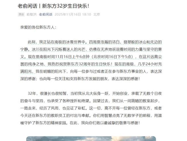 这封内部信开篇描绘了南极壮丽的自然景观,俞敏洪称当地几乎24小时充满阳光,让他对时间的力量与坚守的意义有了更深感悟。他在信中借南极企鹅类比新东方人的团结,提出了新东方要做“希望的播种者”、东方甄选当“商家良知的代表”、文旅业务帮人“把世界装在心里”的目标。但信件中频繁提及个人经历和南极风光,却很少涉及员工的工作压力。