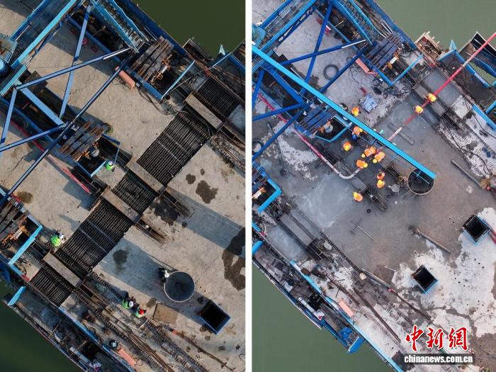 左图为11月25日16时24分大桥浇筑准备工作就绪。右图为11月26日8时17分大桥浇筑工作完成,工人师傅正进行收尾作业。(拼图)记者 刘忠俊 摄
