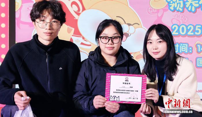图为领养人与机构志愿者拿着宠物的“毕业证”合影。桂林领养日供图
