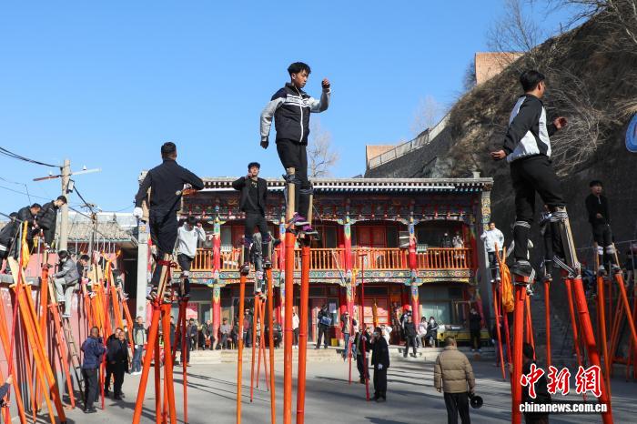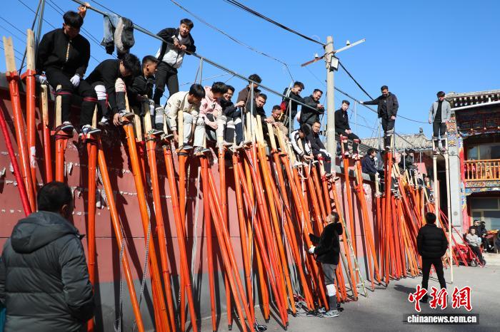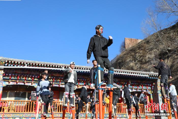 1月22日,青海湟中,返乡大学生和“10后”青少年参与传统社火高跷排练。随着马年春节脚步临近,青海基层组织的文艺表演也进入紧张排练中。中新社记者 马铭言 摄