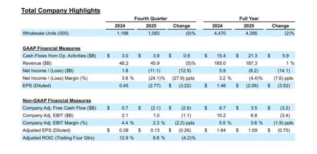 这主要源于约195亿美元特殊项目费用计提——这一计提与福特战略调整直接相关,包括取消部分大型电动汽车生产计划、业务重组及资产减值等。若剔除特殊项目影响,调整后息税前利润为68亿美元。虽较2024年下滑了3.5%,但在行业转型期仍保持了一定的盈利韧性。