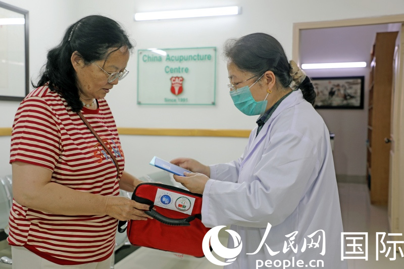 义诊期间,巴基斯坦岐黄中医中心的医生向在巴中国公民发放医疗急救包。人民网记者 赵益普摄