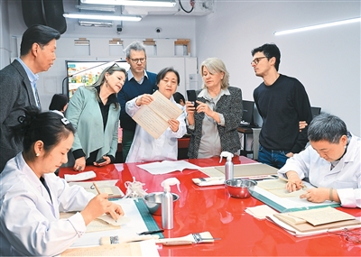 意方专家在中国历史研究院图书档案馆文献修复室参观了解该馆古籍修复技术。