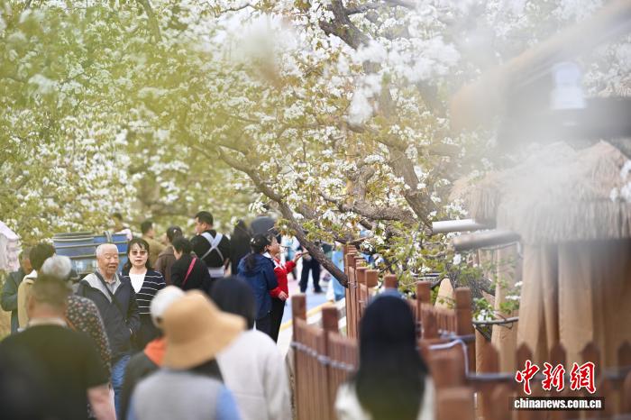 4月12日,位于甘肃省兰州市皋兰县什川古镇的万亩百年古梨园花开吸引游人踏青拍照。中新社记者 李亚龙 摄