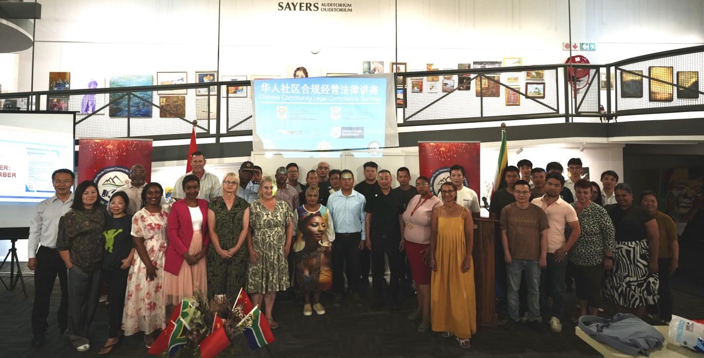 人民网约翰内斯堡4月18日电(记者郑翔)日前,由开普敦华助中心、花园大道警民中心联合西开普省劳工部、内政部、国家强制性规范管理局、经济开发旅游部、花园大道市政厅及警察局共同举办的华人社区合规经营普法讲座在乔治博物馆顺利举办。南非警方花园大道地区少将加大茨加纳、该区区长代表本杰明,以及来自乔治、奥松、奈斯纳等地的侨胞、中国城管理方、侨资企业和商户代表近60人线上线下参与,开普敦华人律师董钢主持讲座。