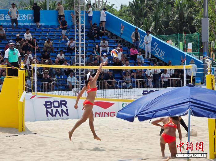 4月23日,三亚亚沙会沙滩排球项目在天涯海角竞赛场馆群拉开战幕。图为中国沙滩排球组合蒋凯悦/董颉在首轮比赛中的一次进攻。记者 王晓斌 摄