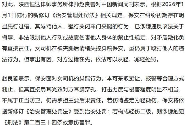 知情人士还表示,网传视频并不完整。当事人调取现场监控视频后发现,在女司机脚踹保安之前,保安先对她进行了言语攻击并敲打车窗。当女司机试图下车时,保安强行关上车门,夹住了她的腿。