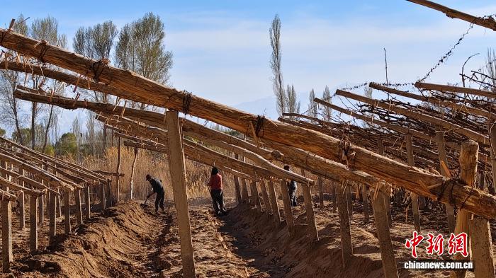 中新网兰州4月9日电 (王斌银 周玉玲)4月以来,在甘肃敦煌市阳关镇等葡萄主产区,广袤的田间地头一派繁忙景象,农户们抢抓农时,为埋土越冬的葡萄藤“掀被”出土、整理上架,6.8万亩葡萄藤在春日暖阳中舒展枝蔓,勾勒