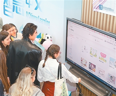 “中文智趣站·国际中文教育教学资源展”现场。  来自哥斯达黎加、曾参加过“汉语桥”比赛的何诗怡,在日前于北京举办的“中文智趣站·国际中文教育教学资源展”上体验了各类中文智慧教学平台后连连称赞,认为