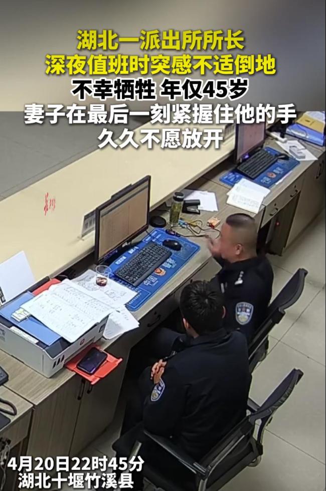 4月20日,湖北省十堰市竹溪县公安局龙坝派出所所长毛新宇工作时突感不适倒地,经同事和医生抢救无效,于4月21日因公牺牲,年仅45岁。在他生命最后一刻,妻子紧握住他的手,久久不愿放开
