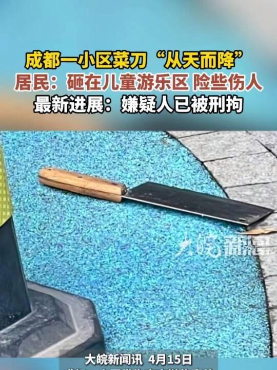 4月15日,成都中南樾府小区发生一起高空抛物事件,一把菜刀从天而降,险些砸到人。这把菜刀落在儿童游乐区,引起了居民的恐慌。有人立即报警,警方迅速到场调查,并在现场拉起了警戒线