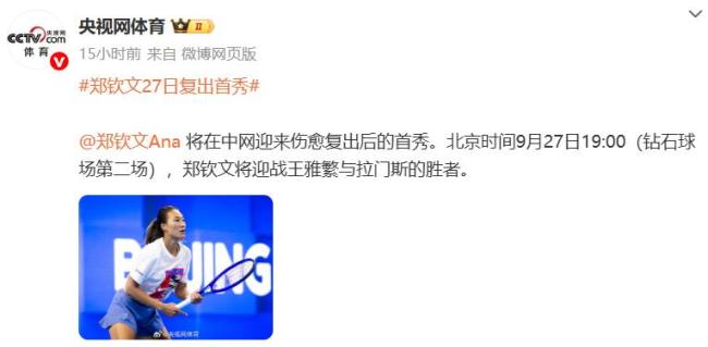 9月24日,中国网球运动员郑钦文确认将在中网迎来中国赛季的首秀。她将于9月27日登场,迎战王雅繁与拉门斯之间的胜者。这是她接受手肘手术后的复出首秀。9月23日,中国游泳运动员张雨霏出现在郑钦文训练的网球馆外,观看她的训练