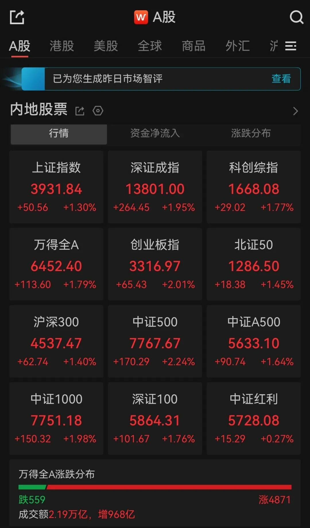 25日,A股三大指数高开后震荡上行。Wind数据显示,截至收盘,上证指数涨1.30%,深证成指涨1.95%,创业板指涨2.01%。