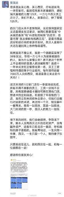 西贝董事长贾国龙在朋友圈正式回应了大规模闭店事件,确认将在一季度关闭全国102家门店,占总数的30%。他将经营危机归咎于持续125天的“网络污蔑”,这一事件引发了公众对餐饮业危机管理、预制菜争议及企业责任的多维度讨论