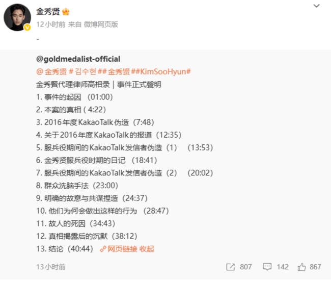 10月28日,金秀贤的官方微博账号转发了所属经纪公司goldmedalist对金秀贤与已故女星金赛纶纠纷事件的正式声明。这是金秀贤自2020年8月在微博分享生活动态后的最新更新